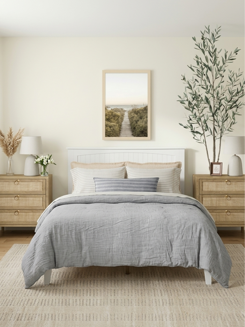 Coastal style is all about keeping things calm, clean, and airy. Think linen bedding in soft whites and naturals, woven textures, and the kind of relaxed layering that feels like a weekend at the beach. It's one of those styles that looks effortlessly put together — and with the right pieces, it actually is.